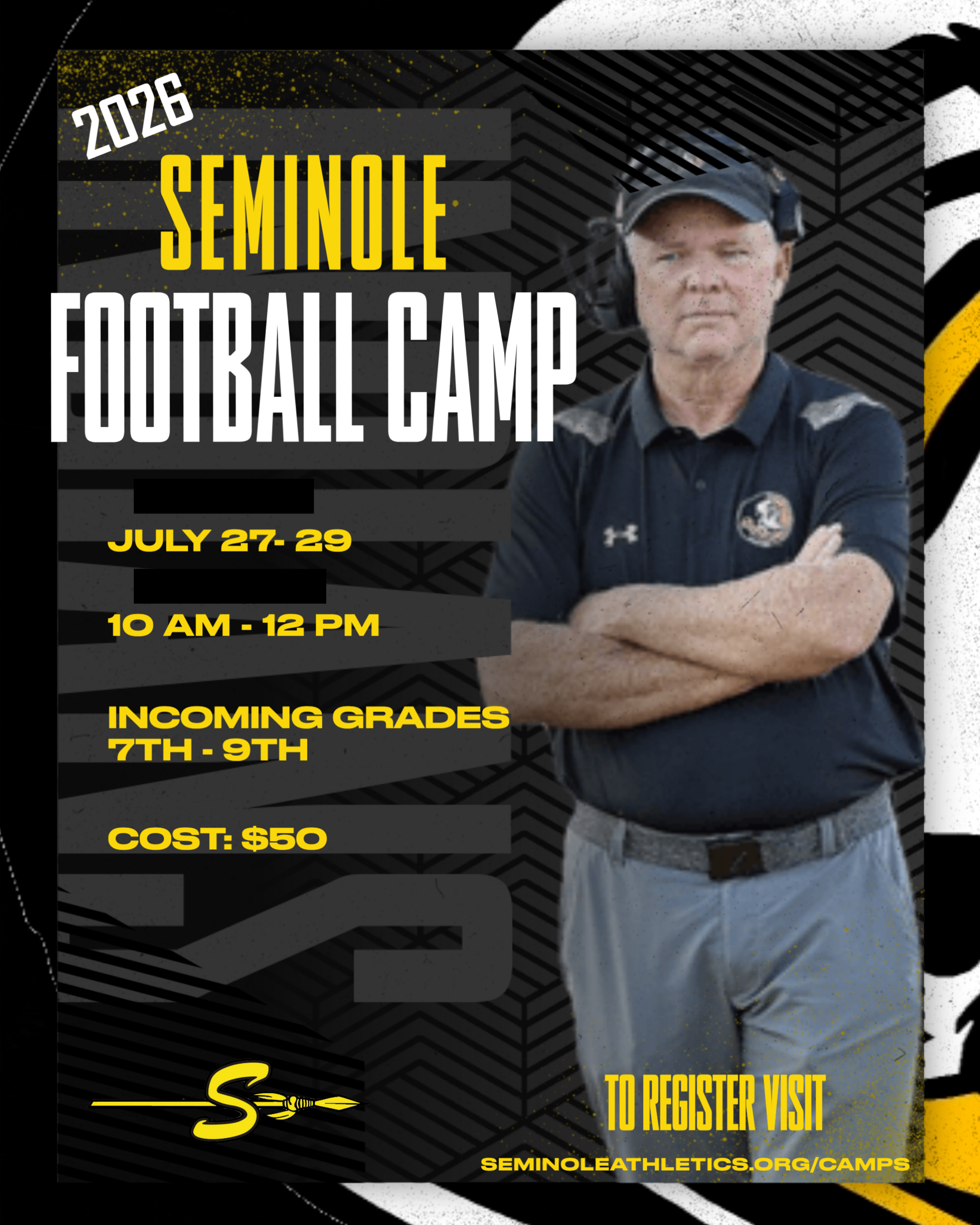 | DESC: | Join us for the 2026 Seminole Football Camp. Click on the "REGISTER" button to the right to register and pay online! Grades: 7th-9th. |