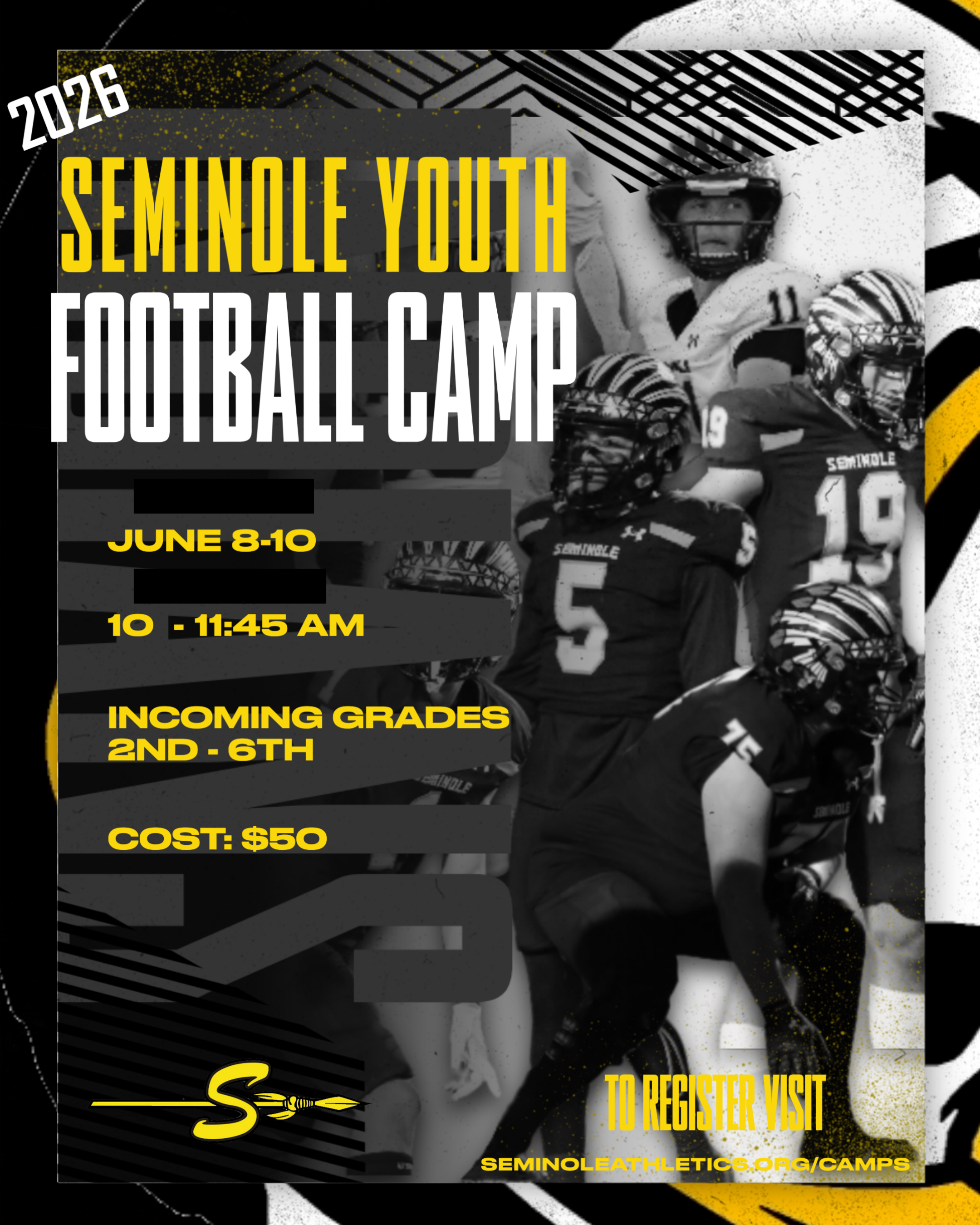 | DESC: | Join us for the 2026 Seminole Youth Football Camp! Click on the "Register" button to the right to register and pay online! Grades: 2nd-6th. |